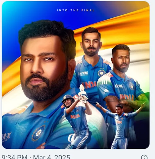 भारत फाइनल में पहुंच गया है जो दुबई में 9मार्च को खेला जाएगा जहां उन्होंने इस टूर्नामेंट में अपने सभी मैच खेले हैं। हालांकि यह कहना उचित है कि यह उनके लिए फायदेमंद रहा है, वे ICC ODI आयोजनों में 14 वर्षों से एक बेहतरीन टीम रहे हैं। 2011 में विश्व चैंपियन, 2013 में CT विजेता, 2015 WC में सेमीफाइनलिस्ट, 2017 CT में उपविजेता, 2019 WC में सेमीफाइनलिस्ट और 2023 WC में उपविजेता। क्या रोहित एंड कंपनी, जिसने पिछले साल टी20 विश्व कप जीता था, एक और ICC ट्रॉफी जीत सकती है? उनका सामना दक्षिण अफ्रीका या न्यूजीलैंड से होगा - दो टीमें जो कल लाहौर में एक-दूसरे से भिड़ेंगी।